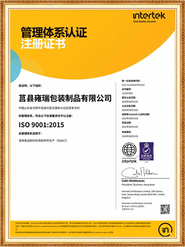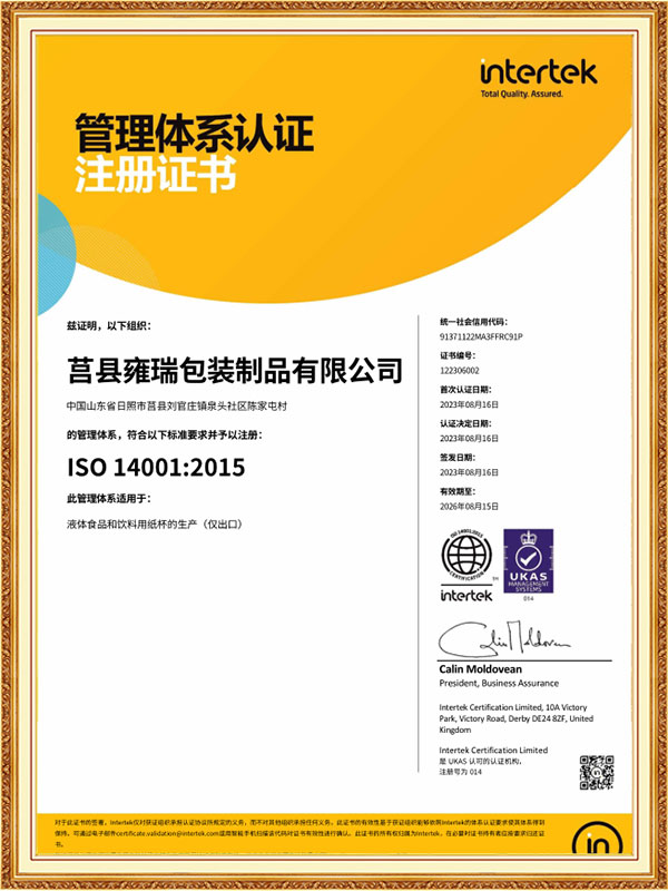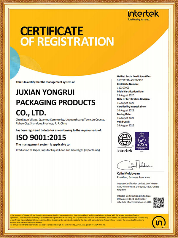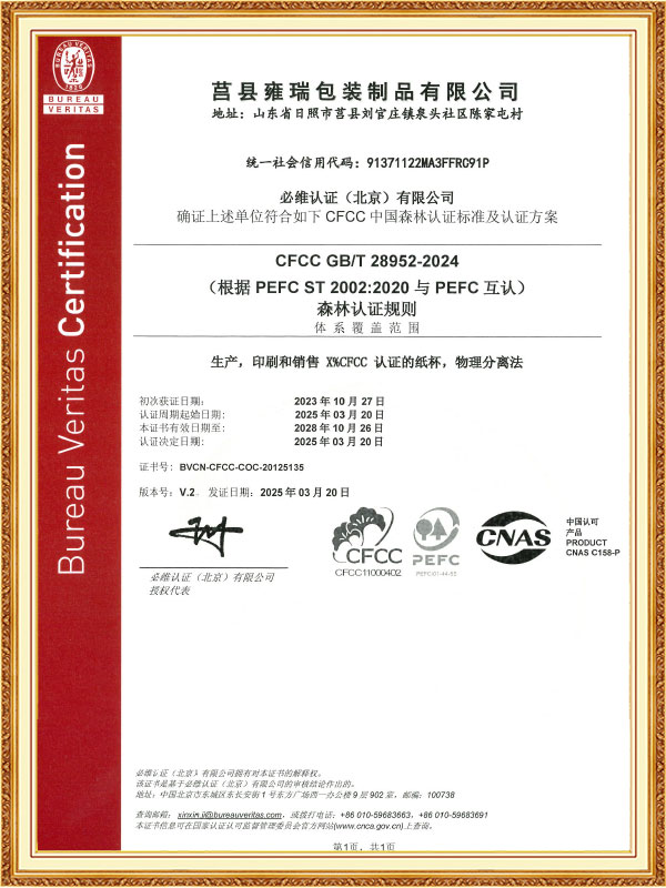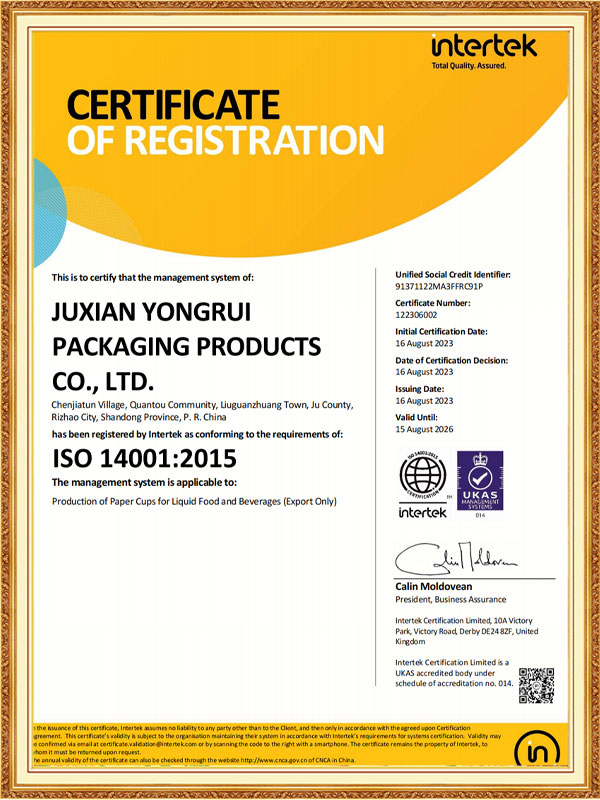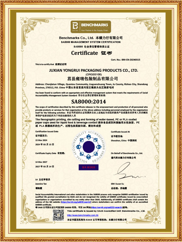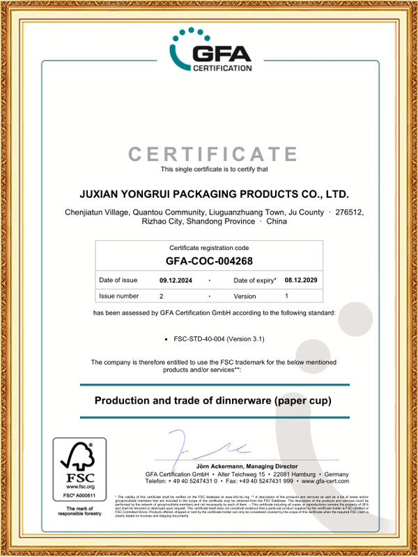 厳格な国際基準を満たすため、当社製品はISO 9001、ISO 14001、FSC、BRC、DINなどの認証を取得しています。さらに、Yongrui PackagingはFSCおよびEUDR原材料を使用した紙コップの開発を積極的に進め、包装業界の持続可能な発展を確固としてリードしています。デザインからアフターサービスまで完全な「ワンストップ」サービスを提供し、チームは24時間体制でサポートします。同時に、OEM&ODMサービスを提供し、ブランド構築をお手伝いします。